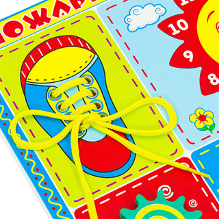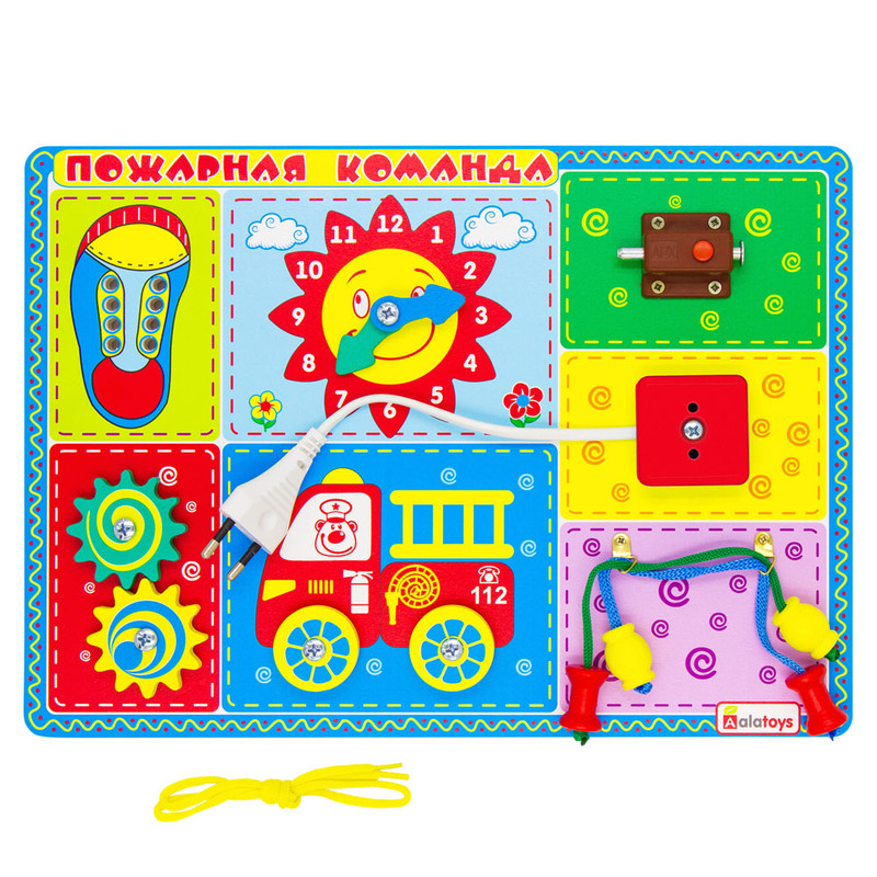 Бизиборд Пожарная команда — познавательная многофункциональная игрушка, которая объединяет в себе несколько интересных: шнуровка, вращающиеся шестеренки, замочек, розетку, перетягивающиеся шнурочки, часики в форме милого солнышка, а также нарисованную пожарную машину с добрым пожарным мишкой, у коротой крутятся колесики.