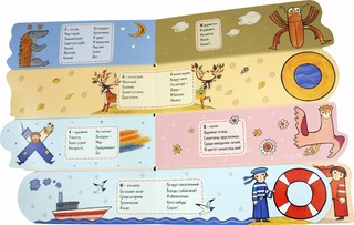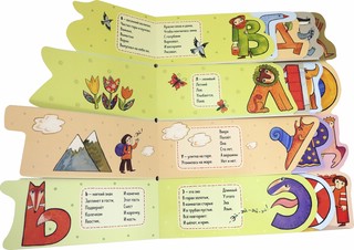 Каждая буква нарисована в виде зверя, птицы, забавного человечка или сказочного существа, и у каждой — своя картонная страничка, которую легко найти и открыть. Фигурные странички выглядывают одна
