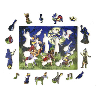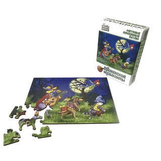 Фигурный пазл бренда Нескучные Игры «Бременские музыканты» отличается от стандартного необычной формой деталей. Кроме того, часть деталей выполнены в форме предметов, связанных с тематикой картинки.