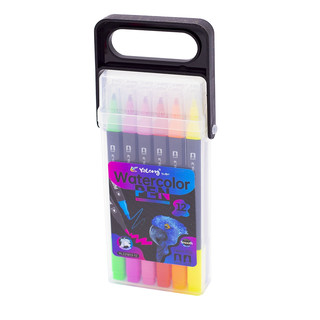 Набор из 12 цветных фломастеров со смываемыми чернилами, в квадратном корпусе. Поставляются в пластиковом футляре с ручкой. Колпачки вентилируемые.