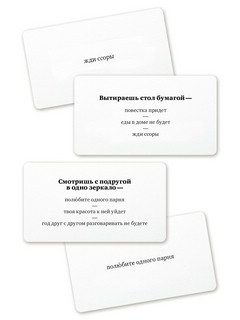 На лицевой стороне каждой карточки приведена первая часть приметы и три варианта ее окончания, из которых только один правильный. Задача игрока — определить его и, перевернув карточку, проверить себя или другого участника игры.
