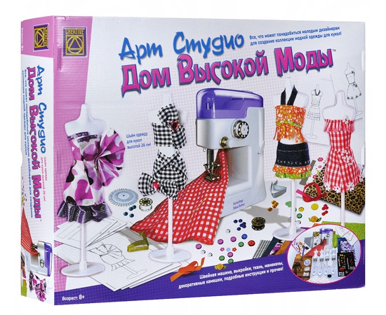В комплект входит настоящая швейная машинка, манекены, эскизы, выкройки и все, что потребуется для творческой работы кутюрье.