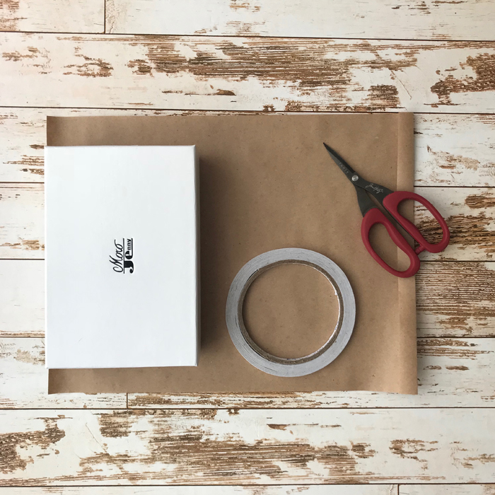 Можно обойтись минимумом: упаковочная бумага и лента, ножницы, скотч и клейСначала обернём подарок упаковочной бумагой: