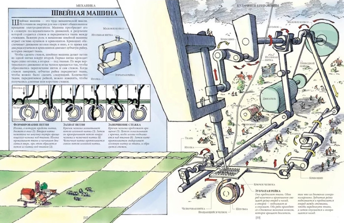 А как устроена внутри швейная машинка? Как у неё получаются все эти стежки и петельки?Это лишь малая часть удивительных взаимосвязей между разными на первый взгляд вещами. Задействовав свою фантазию и талант художника на полную катушку, Дэвид Маколи создал потрясающую книгу для всех, кому интересно узнать, как работают разные устройства. Истории, в которые попадает главный герой, мохнатый мамонт, помогают понять сложные технологии даже технически не подкованному читателю»