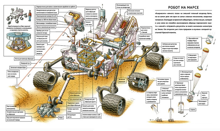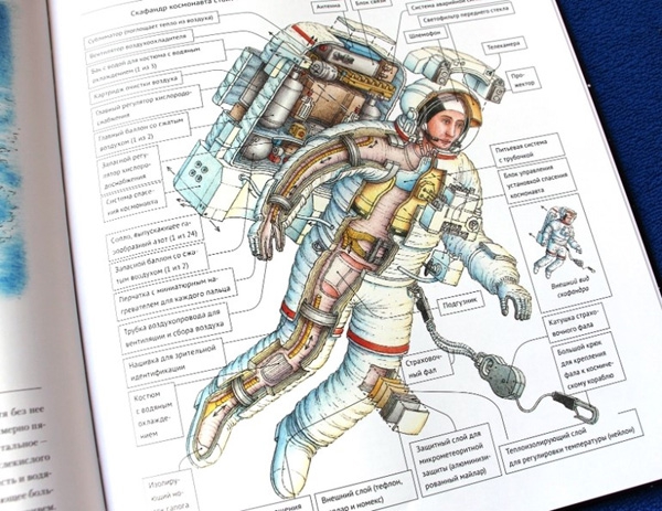 Иллюстрации-схемы подробно описывают строение таких вещей как скафандр, спутники связи, космическая станция...