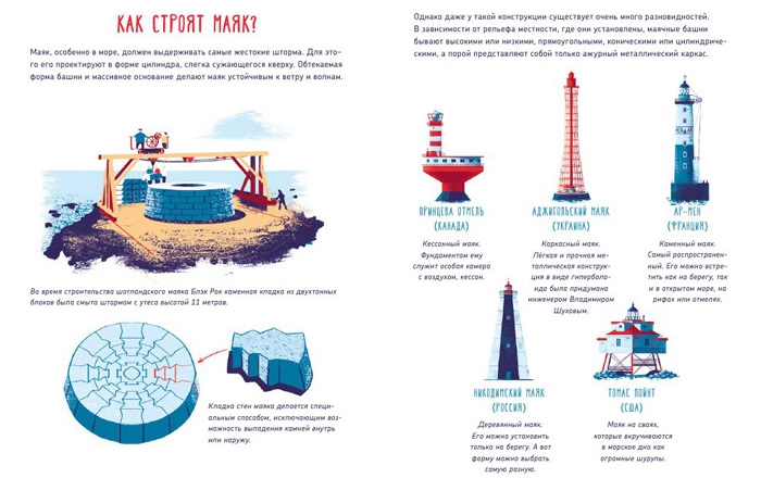 В книге «Как работает Маяк» мы как будто попадаем на школьную экскурсию. Приезжает школьный автобус, и смотритель маяка рассказывает об устройстве маяков, их историю и о том, как используют маяки сейчас.
