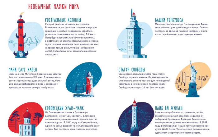 Все изображённые на обложке маяки не плод богатого воображения художника, все они реально существуют. Внутри можно найти их названия и справочную информацию по самым необычным из них. Покажите и расскажите детям, что Ростральные колонны в Санкт-Петербурге — это маяки. А знаменитая статуя Свободы в Нью-Йорке в течении 16 лет тоже работала в качестве маяка.