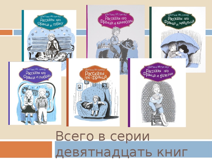 Любая книга — это законченная история. Представляете счастье ребёнка, когда он воскликнет «Мама, я прочел сам ЦЕЛУЮ книгу!»Франц взрослеет от одной книги к другой. В первой ему шесть с половиной лет, а в последней (девятнадцатой) — девять. В то же время нет особенной разницы, с какой книги знакомиться с Францем. Каждая начинается с короткого предисловия: автор напоминает (или впервые рассказывает) читателю, кто такой Франц, сколько ему лет и чем он примечателен. В этом смысле рассказы про Франца чем-то похожи на любимые книжки нашего детства — «Денискины рассказы» Виктора Драгунского или рассказы про друзей Мишу и Колю, сочинённые Николаем Носовым, которые тоже можно читать в любой последовательности.