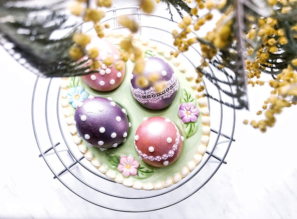 4) Красящие растворы, которые можно приобрести в магазинах, позволяют с лёгкостью разнообразить цветовую палитру пасхального блюда. К тому же есть растворы, которые придают металлический блеск. Как пользоваться таким раствором, написано на упаковке.