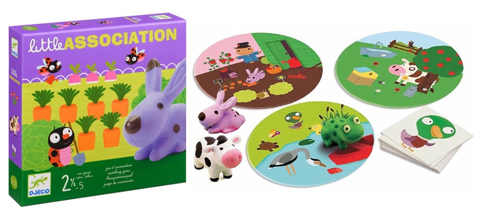 Игра на ассоциации от французского производителя Djeco. Корова живёт на лугу, лягушка в пруду, кролик в огороде. Цель игры поставить героя (кролика, лягушку или корову) на соответствующее поле (луг, пруд или огород), на это указывают изображения на карточках. Если выпадает морковка, значит кролика нужно посадить в огород, а если выпадает рыбка, то лягушку нужно посадить в пруд, только сделать это нужно быстро, а то кто-нибудь может оказаться проворнее :)