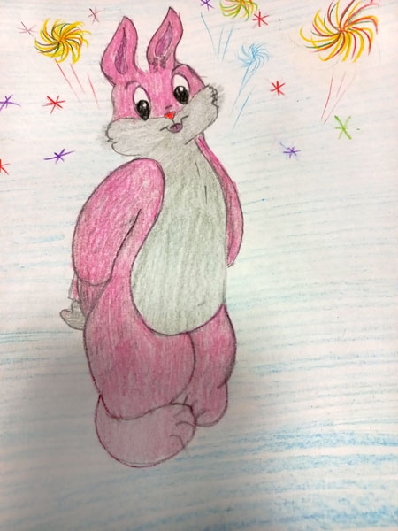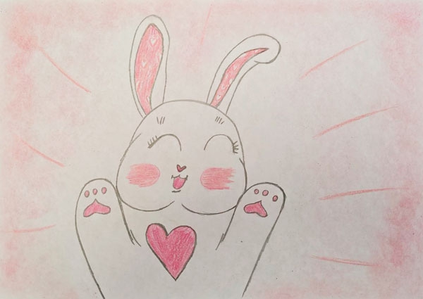 Конкурс Нарисуй Кролика в стиле аниме, Коробова КираМила очень радуется своей победе. Работа выполнена на формате А4 простым и розовым карандашами.