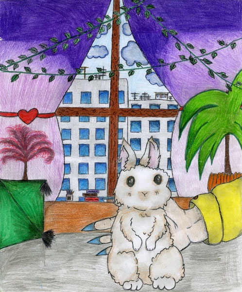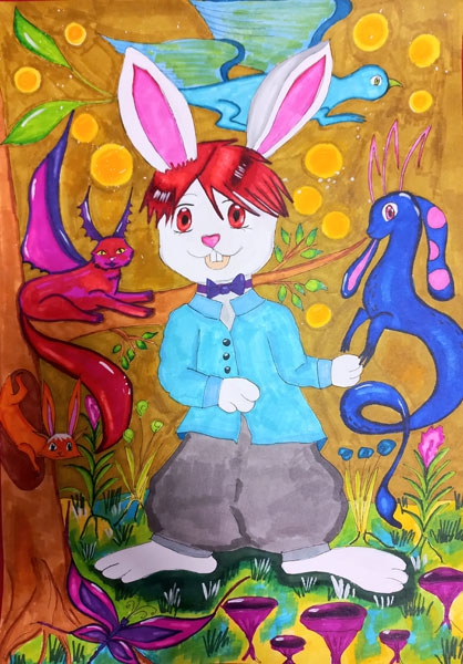Конкурс Нарисуй Кролика в стиле аниме, Сосновская ВикторияБелый кролик Мико, заблудившийся в лесу, попадает в страну фантастических существ. Мико пытается подружиться с каждым из существ, выполняя все их задания, и найти дорогу домой. Формат А3, маркеры, гуашь. Смешанная техника.