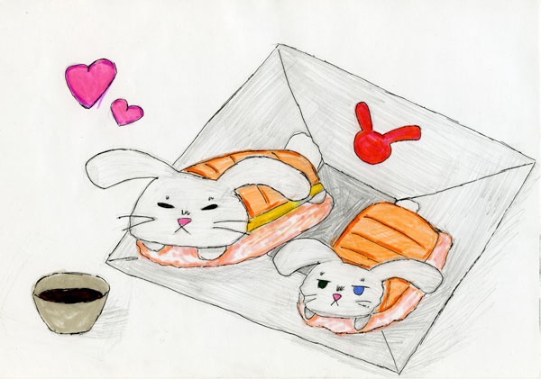 Конкурс Нарисуй Кролика в стиле аниме, Гришнина АлисаЯ нарисовала белых няшных кроликов на квадратной тарелочке, потому что они милые булочки. Белый кролик это вкусно (в значении красоты и милоты)!