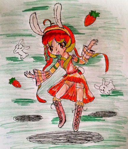 Конкурс Нарисуй Кролика в стиле аниме, Буянова ЕвангелинаТехника: акварель, линер. Кролик Клубника сластёна, собирает урожай клубники и варит варенье. Особенно ему удаётся готовить зефир из клубники.