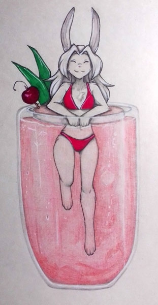Конкурс Нарисуй Кролика в стиле аниме, Большакова АннаРабота была выполнена с использованием цветных карандашей и гелевых ручек . На рисунке изображена девочка кролик белого цвета в стиле аниме, в стакане с лимонадом.