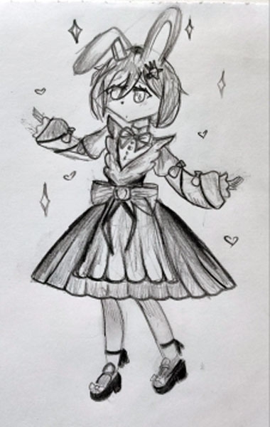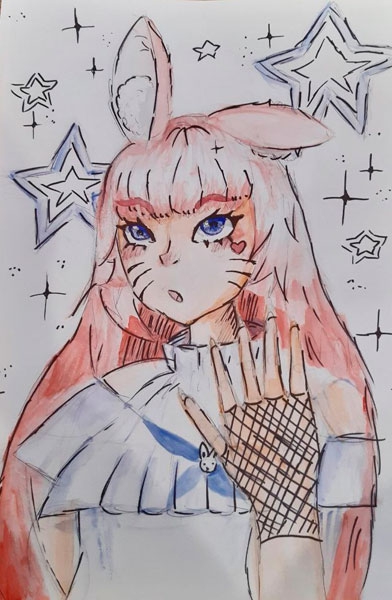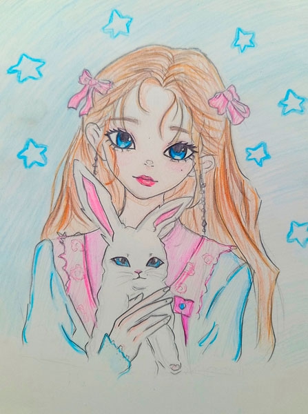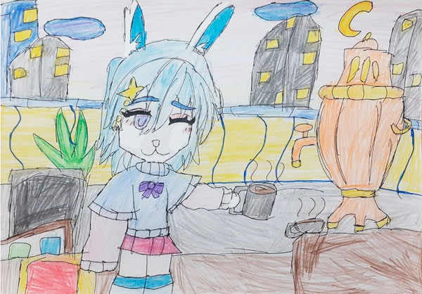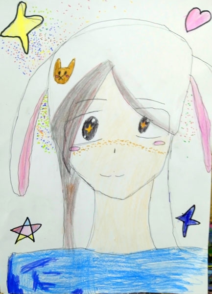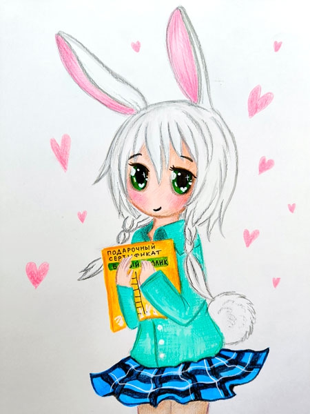 Я очень люблю смотреть аниме, а так же очень люблю рисовать в стиле аниме. Для участия в конкурсе я нарисовала Белого Кролика — девочку. Её зовут Харуми. Она очень добрая и общительная, у неё много друзей. А ещё крошка Харуми любит делать покупки в магазине «Белый Кролик» и разнообразие творческих товаров делает жизнь моей Харуми яркой, весёлой и счастливой! Чего и вам от всей души желаем!616. Плотникова Виктория, 11 лет, "Розовая Звёздочка"