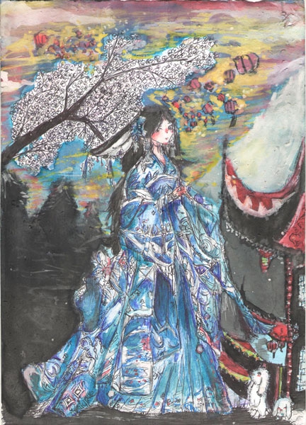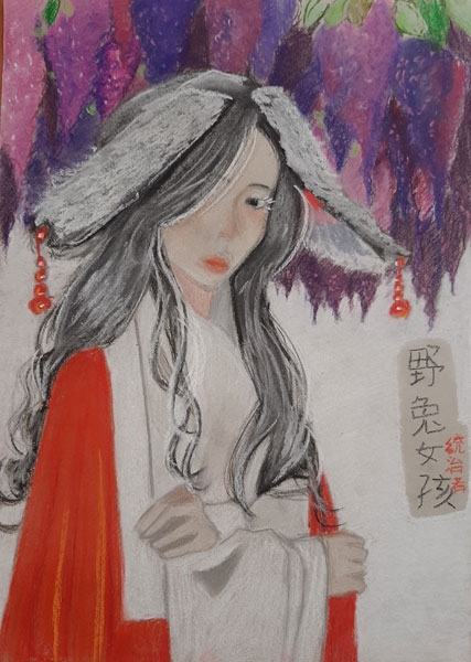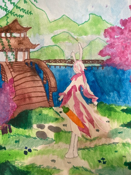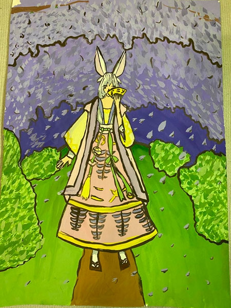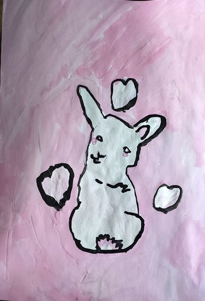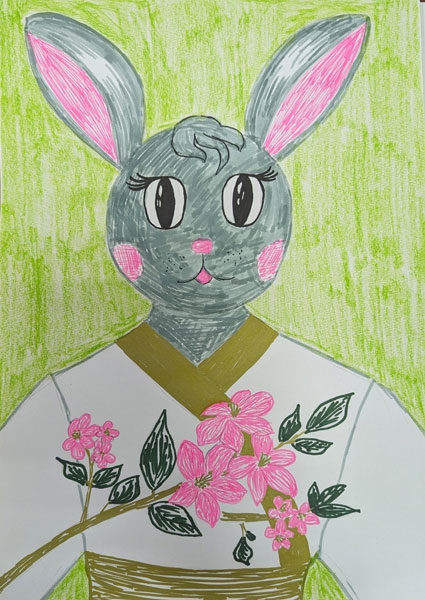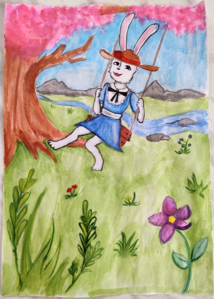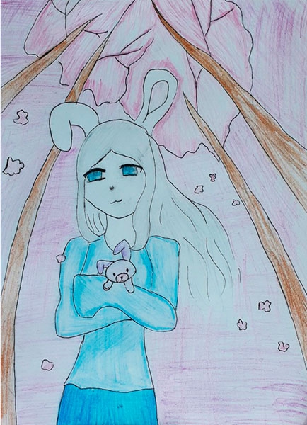 Кролик в образе хрупкой девушки изображен на фоне цветущей глицинии, сезон которой в Японии приходится на начало мая, как олицетворение молодости, расцвета и красоты.636. Блинова Руслана, 10 лет, "Розовая зайка"