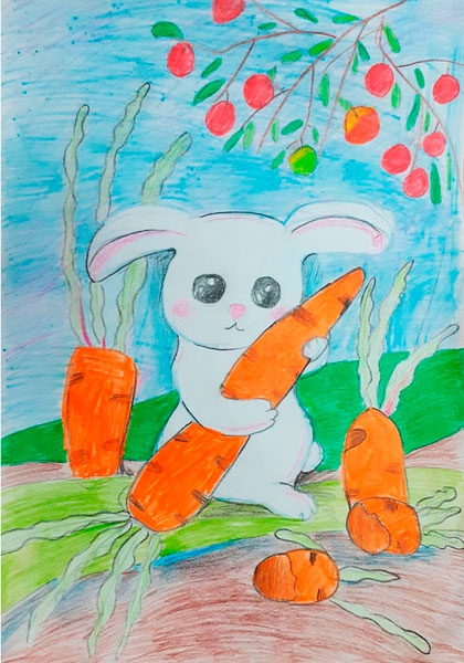 684. Чернатова Виктория, 10 лет, "Белый кролик собирает морковку"
