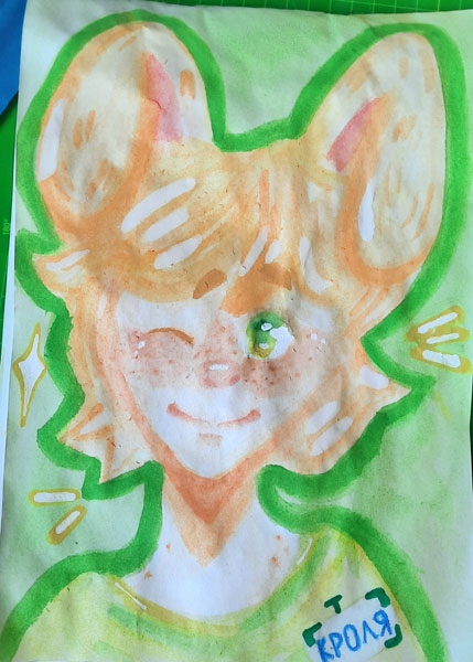 На картине мальчик с ушками кролика. У него курносый нос, веснушки на лице и зелёные глаза. Он носит зелёную футболку и именной бейдж, как сотрудники магазина "Белый Кролик".674. Орлова Елизавета, 7 лет