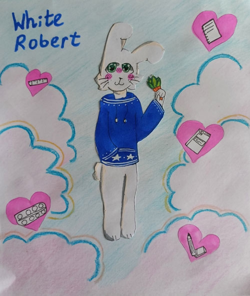 Он обожает покушать, особенно морковку и вообще немного ленивец. Зато он очень добрый и дружелюбный. А ещё кролик любит красные ленточки, обожает детей и играть в головоломки.607. Рогозинникова София, 15 лет, "Доброта спасет мир!"