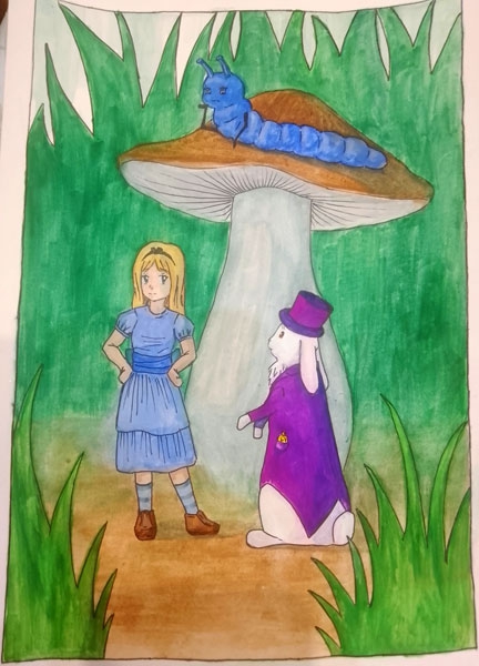 Вдохновилась любимым мультфильмом "Алиса в стране чудес". Часто бывает, что совершенно непохожие личности становятся самыми лучшими друзьями. Они дополняют друг друга и не притворяются кем-то другим, чтобы вписаться в общество. Таких довольно часто считают странными. Но я считаю, что именно благодаря таким людям всё ещё держится на плаву наш мир.661. Котелевская Валерия, 12 лет, "Чанъэ и лунный заяц"