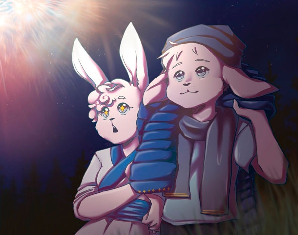 Изображены лучшие друзья Марк и Наоми. Живут они в квартале Красных фонарей. Любое время года — Зима, любимый праздник Новый год. Именно в это время года считается временем чудес, исполнения желаний.621. Елфимова Мария, 12 лет, "Маленькая встреча"