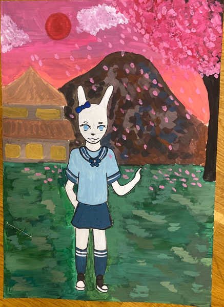 Девочка кролик гуляет под деревом глицинии.697. Балчугова Софья, 14 лет, "Белый Кролик — японский школьник"