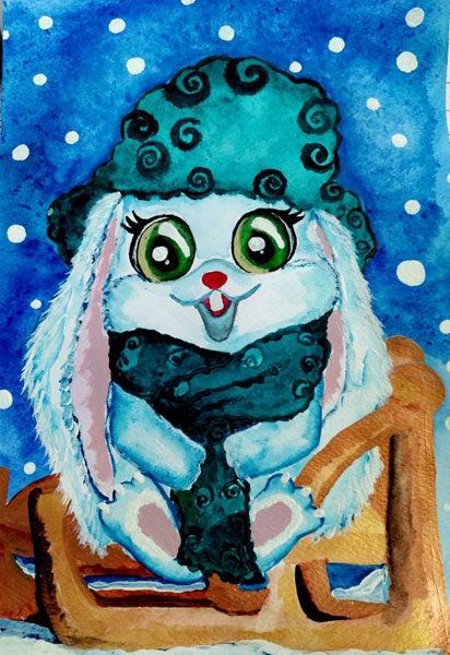 Не думаю, что смогу занять призовое место, но просто интересно поучаствовать. Я нарисовала это за час просто из ниоткуда.689. Полищук Николь, 7 лет, "Счастливый кролик, который попал в зимнюю сказку"