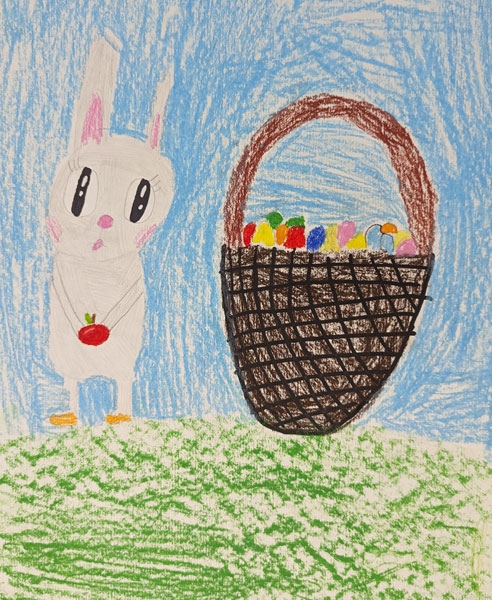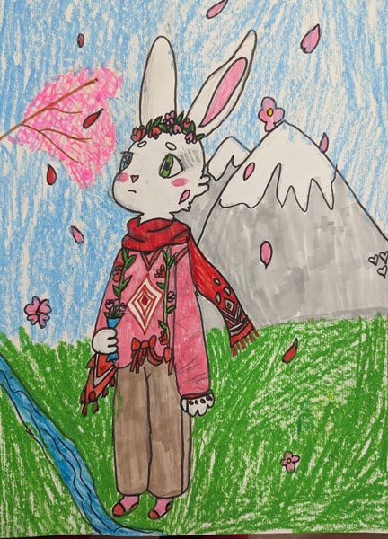 Как будто кролик никогда не видел цветущей сакуры и очень рад посетить японский сад.612. Максякова Ксения, 8 лет, "Пасхальный кролик"