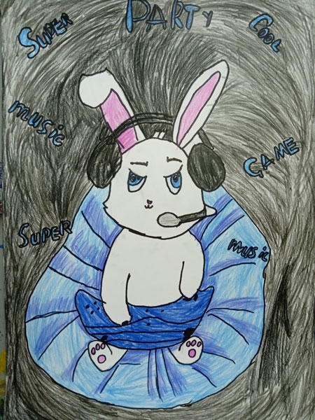 Для меня "белый кролик" это не просто кролик, выполненный в светлых тонах, это ещё невинное животное, которое не знает бед. Кролик сам по себе довольно милое и безобидное создание, а белый цвет только приумножает эту безобидность. Я решила не рисовать чисто белое животное, а хуманизировать его, показать невинную девочку-зайку, которая приостановилась на своём пути и чему-то удивилась.651. Мягкая Алëна, 8 лет, "Геймер кролик"