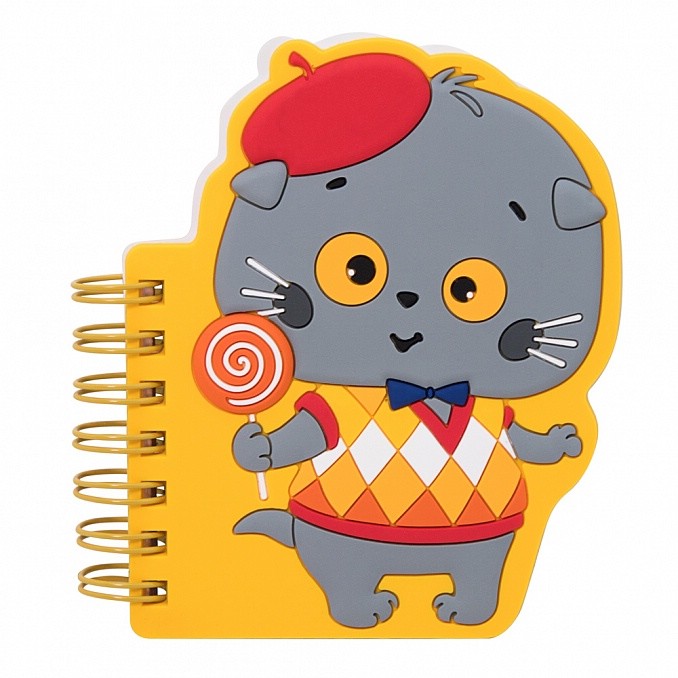 Небольшой блокнот «Басик» с обложкой из ПВХ в виде силуэта котика. Размер 10 см х 9 см. 50 тонированных листочков. На спирали.