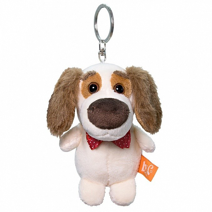 Пес — брелок Бартоломей с галстуком — бабочкой из красной ткани в белый горошек никого не оставит равнодушным.