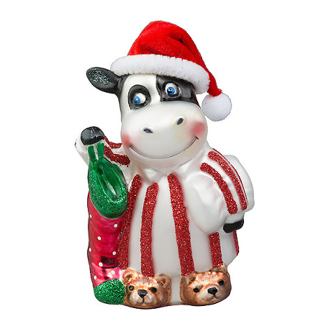 Стеклянная игрушка на ёлку — Бычок «Пижамная вечеринка» из коллекции символов года «33 коровы» от Holiday Classics. Трогательная ёлочная игрушка дышит домашним уютом и гостеприимством зимних рождественских праздников.