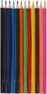 В наборе 12 цветных карандашей треугольной формы, изготовленных из натурального дерева.
