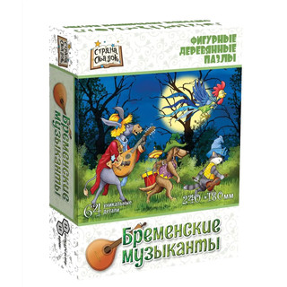 Фигурный пазл бренда Нескучные Игры «Бременские музыканты» отличается от стандартного необычной формой деталей. Кроме того, часть деталей выполнены в форме предметов, связанных с тематикой картинки.