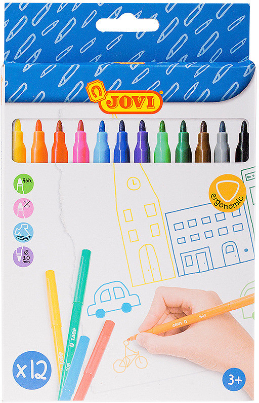 Набор фломастеров JOVI с особо прочным наконечником и вентилируемым колпачком. Толщина линии письма — 3 мм, а длина линии письма составляет 400 метров. В наборе 12 ярких цветов: жёлтый, красный, чёрный, коричневый, синий, зелёный, серый, розовый, голубой, фиолетовый,