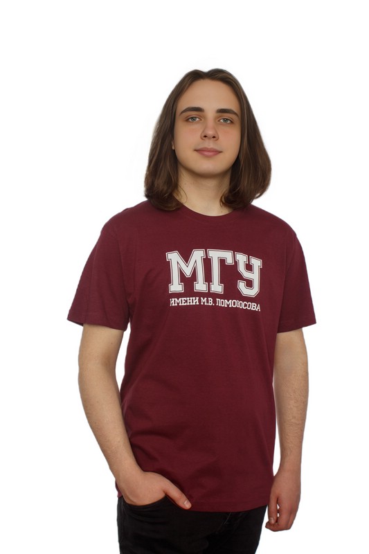 Футболка с надписью МГУ имени М.В. Ломоносова на русском языке.Европейский стандарт качества данных футболок предполагает устойчивость к деформации и вымыванию цвета при стирке. При окрашивании ткани применяли созданные на основе натуральных компонентов красители.