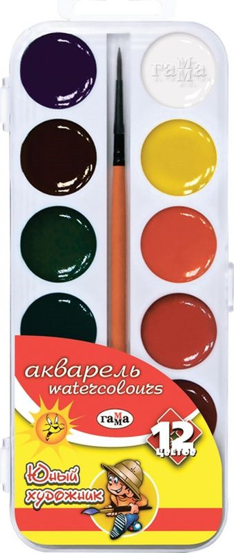 Краски акварельные медовые 12 цветов для школы и творчества. Упаковка — пластиковая коробочка, в наборе есть кисть.