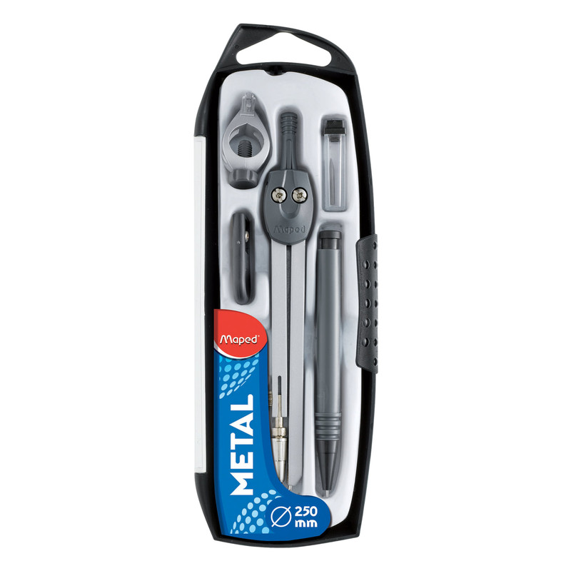 Готовальня «Start» в ударопрочном пенале с подвесом. Набор из пяти предметов. Металлические штанги с повышенной жесткостью, максимальный диаметр — 25 см.