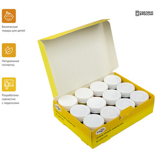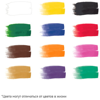 Краски фасуются в пластиковые герметичные баночки с логотипом на крышке. В упаковке 12 цветов: белый, алый, коричневый, зелёный, жёлтый, охра, синий тёмный, фиолетовый, оранжевый, розовый, розовый.