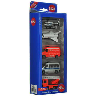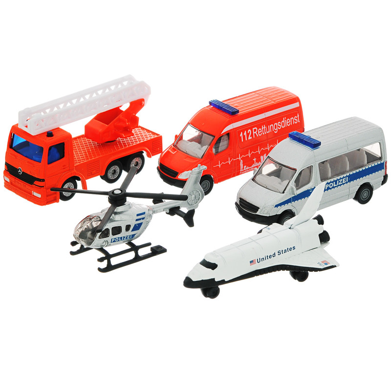 Игровой набор «Siku» несомненно понравится вашему ребенку и обеспечит увлекательный досуг. Набор включает машинку скорой помощи, полицейскую машинку, полицейский вертолет, шаттл и кран. Предметы выполнены из металла с использованием высококачественного пластика.