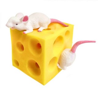 Кубик сыра имеет размер 5×5 см., легко растягивается в разные стороны, а внутри он полый, там есть свободное место для мышат. В набор входят 2 белых мышонка с глазастыми мордочками, розовыми лапками и длинным хвостом. Зверята не прочь полакомится ароматным сыром и даже «погрызть» его изнутри. Длина мышек с хвостом 6 см.