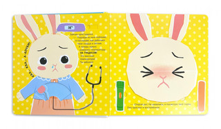 Маленький зайчик заболел. Измерь ему температуру, сделай укол, рентген и ингаляцию, напои лекарством и уложи малыша спать. Все необходимые процедуры ты сможешь выполнить прямо в этой книжке, благодаря подвижным элементам! Похоже, зайчик уже идёт на поправку. Но на последней страничке тебя ждут новые пациенты. Что случилось? Кто следующий?