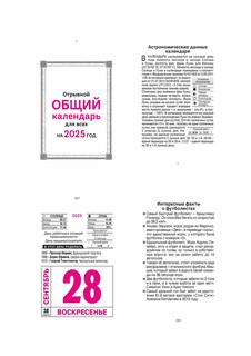 Отрывной настенный календарь на все 365 дней 2025 года с указанием государственных, профессиональных и международных праздников, а также дней рождений известных людей. На страницах календаря читатель найдёт множество интересных и любопытных фактов, рецептов, головоломок, стихотворений, анекдотов. Каждый листочек календаря предлагает занимательное чтение для любителя отрывных календарей любого возраста. Как и в любом отрывном календаре, на каждый день года указаны моменты восхода и захода Солнца и Луны, фазы Луны, долгота дня для Москвы, приводятся данные о прохождении Луны по знакам Зодиака.