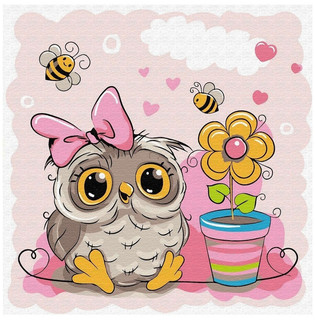 С помощью набора для творчества можно нарисовать милого совёнка с цветочным горшком. Над цветком летают пчелы. Количество красок: 12. Уровень сложности: 2 (лёгкий). Состав набора: прогрунтованный холст из натурального хлопка на деревянном подрамнике, нейлоновые кисти, 3 шт, акриловые краски, устойчивые к выцветанию.