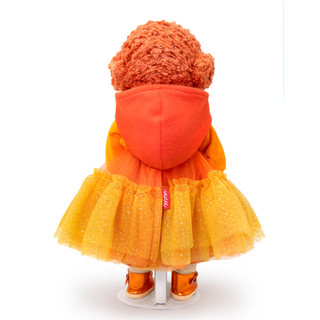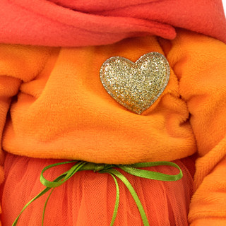 Мягкий свитшот с застежкой сзади сшит из нежного софта цвета оранжевого пламени. Спереди свитшот украшен золотистым сердечком из глиттерного материала. К свитшоту прилагается интересная деталь — объемный отстегивающийся капюшон из софта цвета оранжевой хурмы.