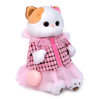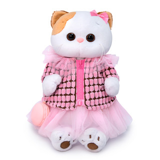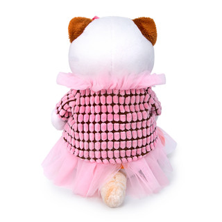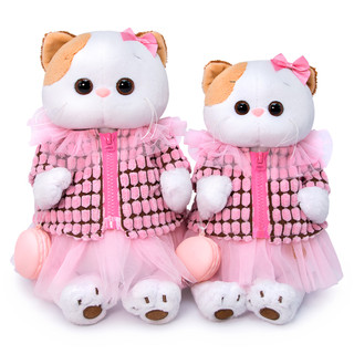 Ли‑Ли в очаровательном комплекте в розовых карамельных оттенках. Курточка из необычного вельвета с воротничком оборкой из нежно‑розовой сеточки, также из сеточки сшита пышная юбочка. В лапках Ли‑Ли держит милый аксессуар — розовое французское пирожное макарон. Завершает комплект розовый бантик на ушке Ли‑Ли.