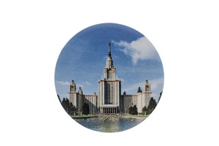 Магнит металлический закатной круглой формы с изображением главное здания МГУ имени М.В. Ломоносова