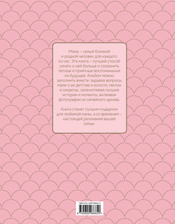 Мама — самый близкий и родной человек для каждого из нас. Эта книга — лучший способ узнать о ней больше и сохранить теплые и приятные воспоминания на будущее. Альбом можно заполнить вместе: задавая вопросы маме о ее детстве и юности, мечтах и секретах, запечатлевая лучшие истории и моменты, вклеивая фотографии из семейного архива. Книга станет лучшим подарком для любимой мамы, а со временем — настоящей реликвией вашей семьи.
