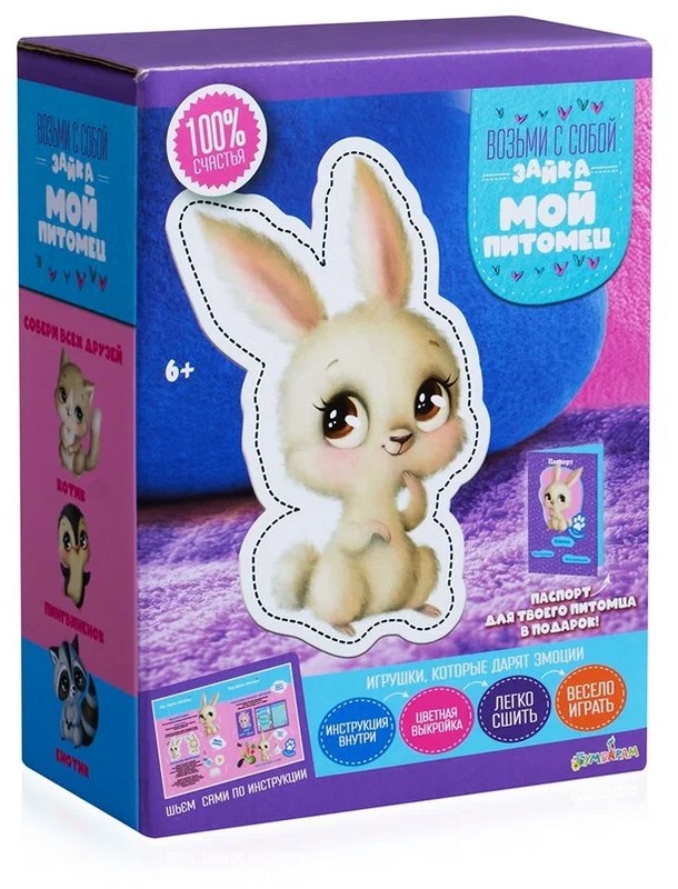 С помощью этого набора ребенок сможет самостоятельно сшить милую игрушку — любимого зверька. Этот набор понравится всем любителям зайчиков, а также станет замечательным подарком на новый год, ведь символ наступающего года — Заяц. В коробке есть все необходимое, понадобится только иголка и нитка. Выкройки на ткани уже выделены по контурам, их остается вырезать и сшить любым удобным способом, заполнив игрушку наполнителем. Не забудьте оживить питомца: положить внутрь деревянное сердечко. Обязательно заполните паспорт: придумайте питомцу имя и опишите, что он любит и где живет. Теперь зверек станет отличным другом для ребенка!
